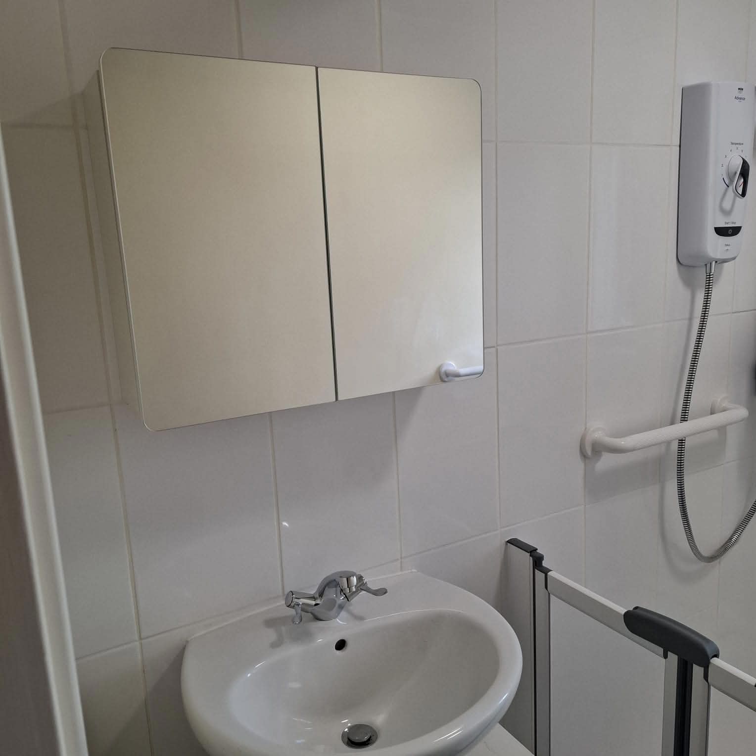 Accessible wet room with waterproof tiling and sleek modern fixtures.